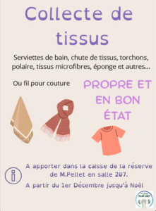 Durant ce mois de décembre les éco-citoyens ont eu comme idée d’organiser une collecte de tissus afin de faire leurs propres créations. Tout cela dans le but de les vendre au printemps lors d’événements tel que la Guill’en Fêtes.